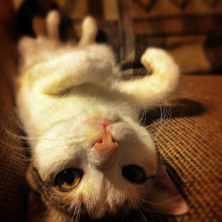 Despite all the exercise she gets—and during the daylight hours, Ruby’s constantly either trying to get us to play Fetch, or bothering Fred—our little Ruby is not exactly the leanest cat around. Fred used always to make me exclaim Ooof! when I’d pick her up, but running around with Ruby has slimmed her down. Ruby, however, is tubby. To put it gently (and accurately), you know how snakes have a bulge along their length when they’ve just snacked on a whole mouse? Ruby looks as if her jaw has unhinged and she’s swallowed a basketball. She doesn’t care. Her favorite thing to do is lie on her back in the middle of the floor with her legs wide open, staring at the world upside-down, belly on display.